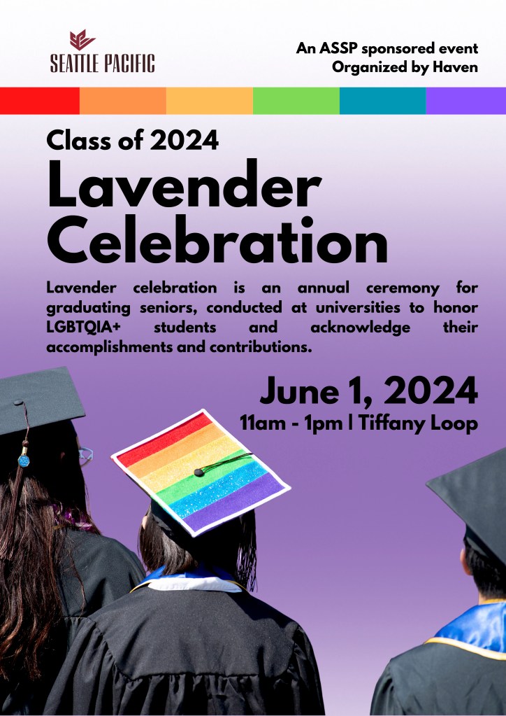 And coming up this weekend: Haven will host Lavender Celebration on Saturday, June 1, 11am – 1pm at Tiffany Loop. Join us in celebrating SPU’s LGBTQIA+ graduates!